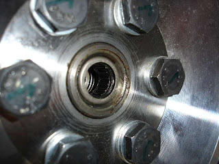 The flywheel bolts were shortened so that the same amount of thread (15mm) showed through the rear of the flywheel as in the original Focus installation (the lightened Pinto flywheel is thinner - no prizes there). All good so far. However, the edges of the bolts clash with the tapered edge of the flywheel. Also the socket fouls on the flywheel.