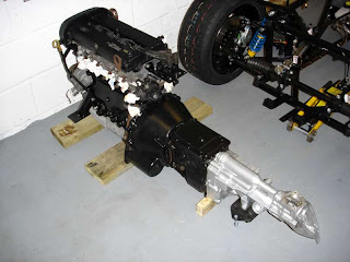Engine and gearbox being fitted. Wooden blocks used in place of the engine rubbers to find the right position for drilling the holes. Despite checking and re-checking the engine and gearbox did end up a little further back than planned. Possibly due to the fact that one of the Tiger engine mounts does not sit flat with the plate on the chassis. When the engine rubber is in place this is squashed on one side to take up the difference.