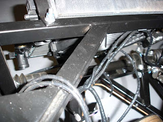 The radiator was mounted at angle for two reasons. The first, as I don't yet have the bodyshell on I don't know how much space I have to work with, so erred on the safe side. Second, if mounted vertically both the pipe openings clash with other things (steering rack and upper chassis rail).